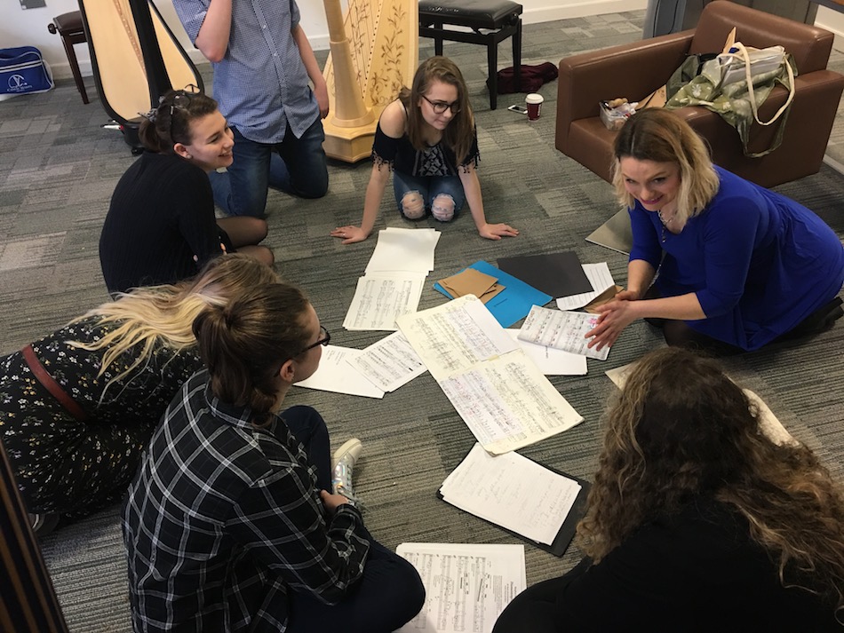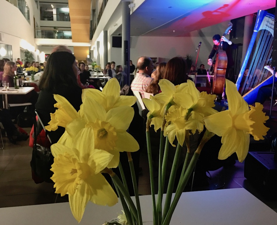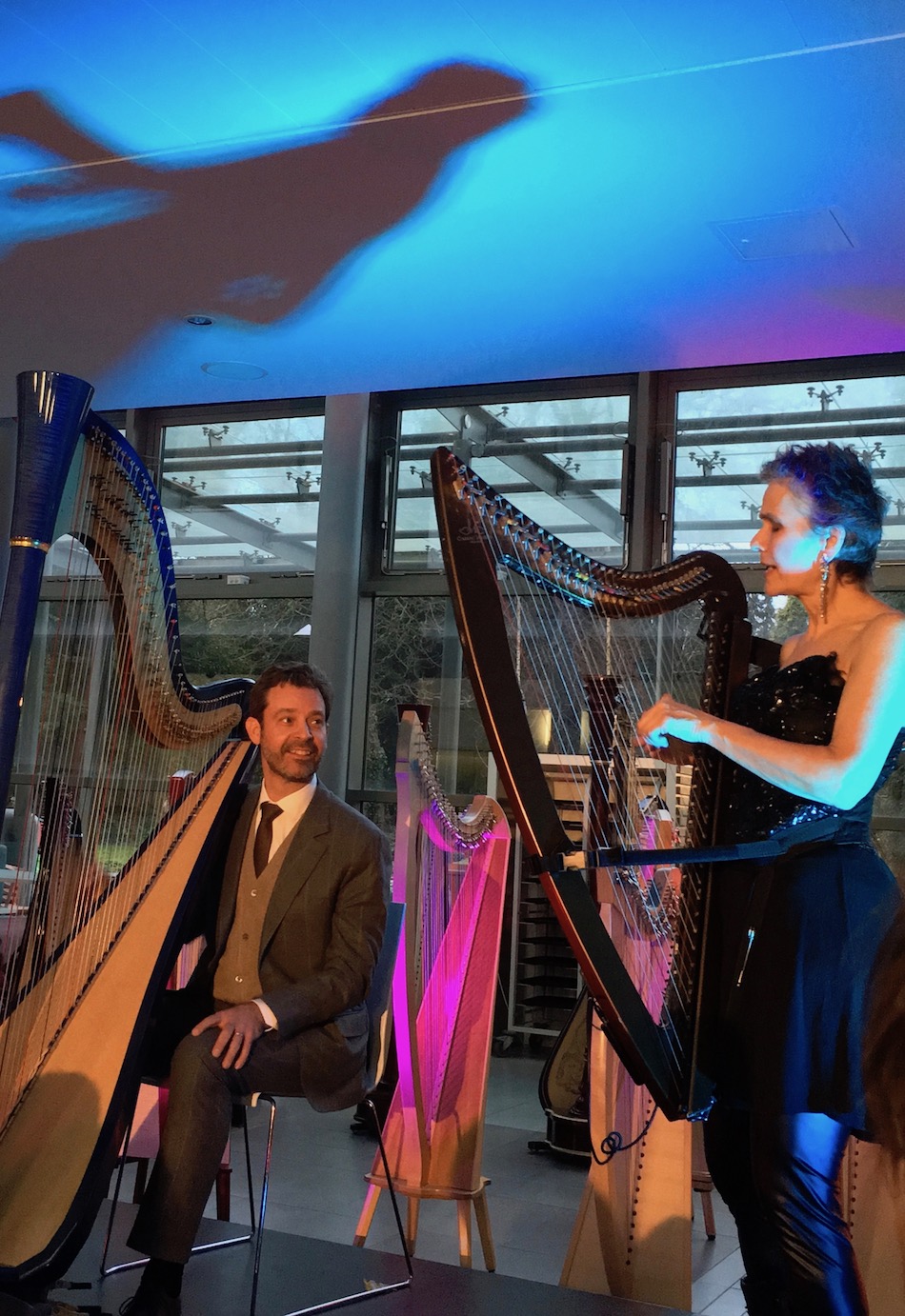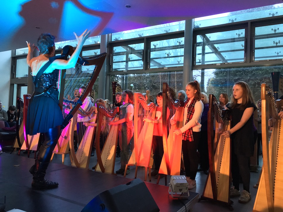 Preaching what they practise, all the performing artists generously gave workshops and classes. From a classical masterclass with Gabriella, to classes for complete beginners with Ben Creighton-Griffiths (returning for another year) and Shelley Fairplay (ditto), there was something for everyone. Eleanor Turner, now making great waves at the Birmingham Conservatoire, ran workshops on contemporary notation, and deciphering scores so that dots become music; together with Balandino Di Donato, Eleanor also explored electronic and computer interfaces with the Camac electroharp. Tara Minton and her trio colleagues Ed Babar and Tom Early gave a jazz class, and Tara another one on her own, about the harp in popular song. We’d loved the Tara Minton Trio only a few days earlier at the opening of our new store in Rotterdam, and it was great to hear them again! Meanwhile, DHC initiated a large group of eager participants into the wonders of her favourite use-anywhere left-hand pattern, and autographed a lot of Blue Lights her fans had brought along to The Ultimate DHC Pluck Off.