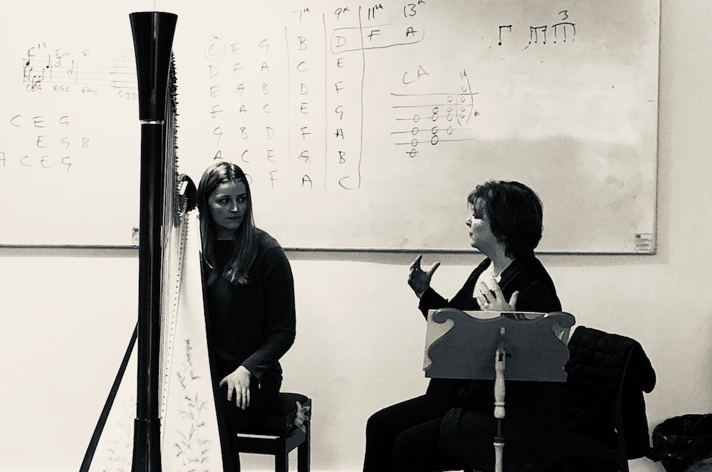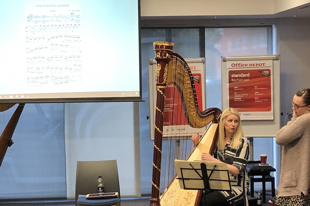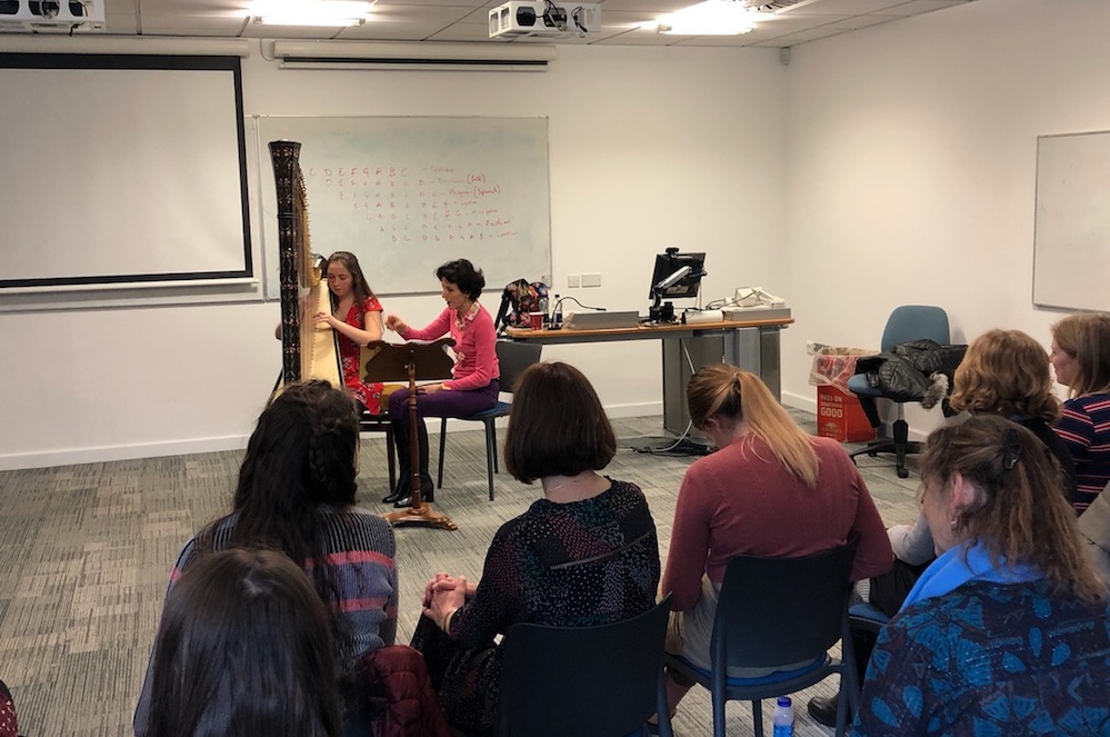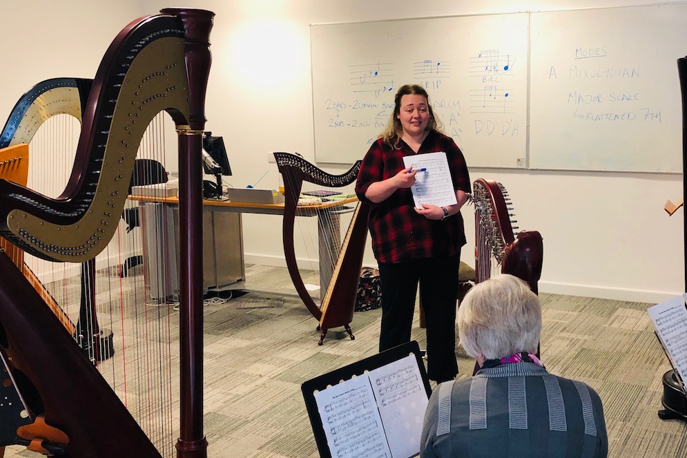 For the Cardiff Camac Harp Weekend 2019, Telynau Vining · Camac Harps Wales had invited some of the most well-known artists from both sides of the Channel. Students could benefit from a classical masterclass with Caryl Thomas, Head of Harp at the Royal Welsh College of Music & Drama, and co-leader of the host artistic committee at the 2020 World Harp Congress (wisely scheduled for July, out of rugby season). Heather Downie, tutor in world music at the Royal Conservatoire of Scotland, introduced us to Scottish pipe tunes in the context of their relationship with the harp, and also gave her increasingly famous “For the Love of Levers” class. Natasha Gale, co-organiser of the Wild Strings jazz and pop harp festival in 2018, gave a pop workshop, vamping and improvising around Ed Sheeran, Jess Glynne, Ariane Grande, etc. Heather and Natasha also both held “Hands on Harp” sessions for complete beginners, of any age, and in another class, Natasha connected the harp with meditation, relaxation and yoga.