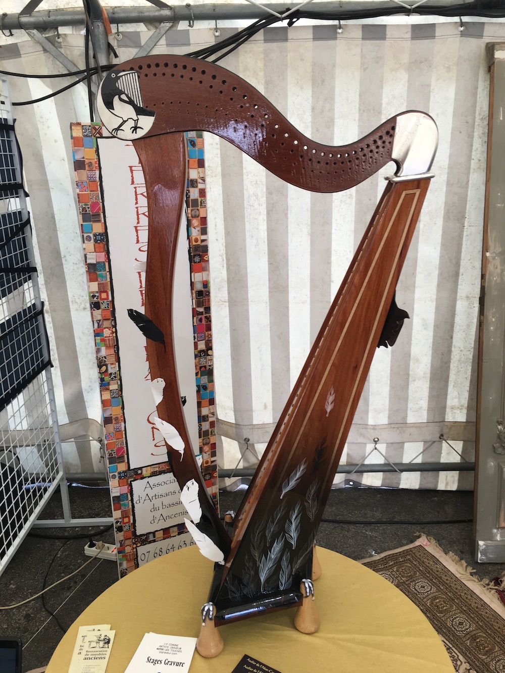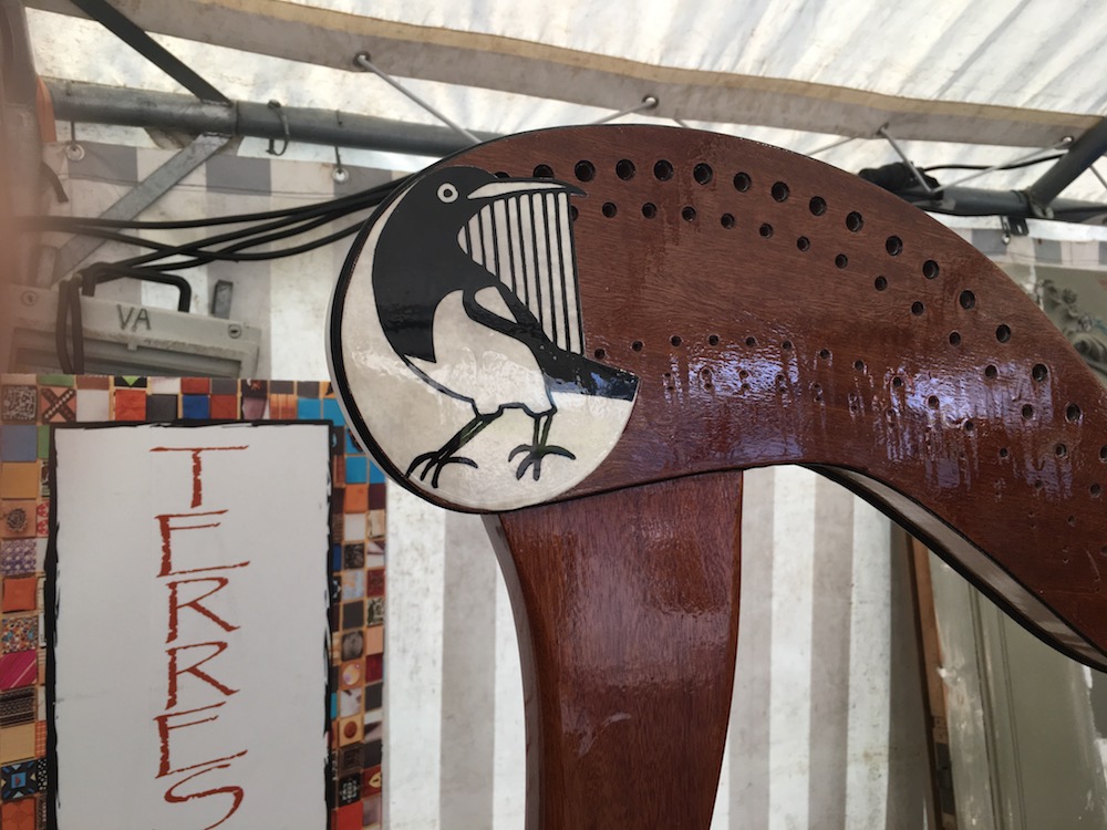 Friday night’s headline acts began joyfully with the opening of the festival village, in front of the Ancenis Theatre. Here, local artisans displayed their work. Familiar faces like Jocelyne Réal (the inlay meilleur ouvrier de France behind our Canopée Concert Grand), Sophie Poyer (who hand-paints our soundboards) and Jean-Bernard Jouteau (artist sculptor of our Art Nouveau, Oriane and Trianon harps) were joined by other craftman of the region. Some had joined forces to create a special lever harp for the occasion. This harp was raffled off to schools, so one lucky harp class is now the proud owner of this unique “magpie” Mélusine. In the middle of the festival village was a large open stage, on which the Christine Lutz Quartet performed gipsy jazz in beautiful sunshine – the party had well and truly begun!