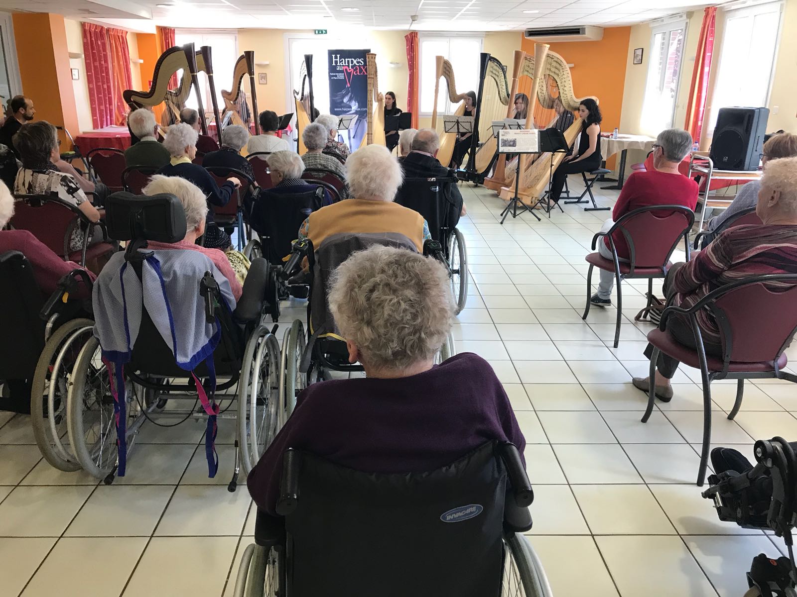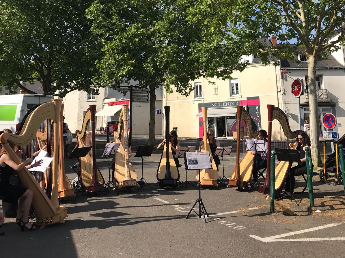 On the first full day of the festival, all our invited harp ensembles began their busy schedule of free touring concerts. The ensembles are a key feature of the Harpes au Max programme: they travel around in buses (each group escorted by two of our strong, handsome and friendly #camacguys to move all the harps…), and perform – everywhere! From the supermarket to the train station, the library to the market square, in hospitals, schools, residential homes, and on the streets, May 18 – 20 saw groups of harps springing harp all over the Pays d’Ancenis. We were thrilled that the following ensembles jumped at this challenge: Ensemble Lyrae (Italy), Ensemble Son Joropo (Colombia), Harporetum (France), the Swinging Harp Sisters (the Netherlands), Trinity Laban Harps (London), and Harpes en Loire (France). Congratulations to them all for their enthusiasm and stamina, giving a lot of pleasure to a lot of people who might not otherwise consider attending a concert.