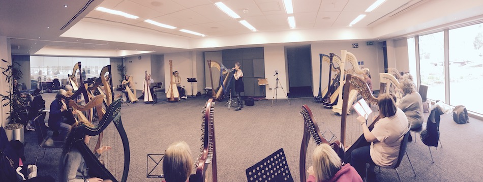 Le pays de Galles est le pays de nombreux grands harpistes : Catrin Finch, Elinor Bennett, Eira Lynn Jones, Meinir Heulyn, Gwenan Gibbard, Ben Creighton-Griffiths, Eleanor Turner, Gwenllian Llyr et Amanda Whiting ont tous participé aux Journées de la Harpe à Cardiff depuis la première édition en 2015. Cette année, Elen Vining avait également invité des collègues venus de Londres : Gabriella Dall’Olio, qui est à la tête du département harpe du Trinity Laban Conservatoire of Music and Dance, et la star de la harpe bleue, Tara Minton. Et… Deborah Henson-Conant qui avait fait une apparition lors de l’édition de 2015 par liaison vidéo, et qui cette année, était bel et bien là, en chair et en os ! Elle a joué lors du concert final, avec Shelley Fairplay et son ensemble Dynamic Harps.