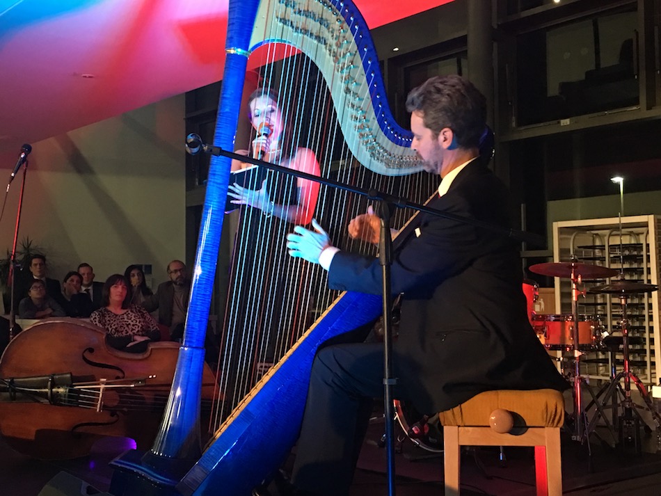 Tous les artistes présents ont également enseigné lors d’ateliers et de stages : une master-class classique avec Gabriella, des stages pour débutants complets avec Ben Creighton-Griffiths et Shelley Fairplay… il y en avait pour tout le monde ! Eleanor Turner, qui réalise de grandes choses au sein du Conservatoire de Birmingham, a également donné des ateliers sur l’écriture contemporaine et le déchiffrage de partitions de façon à ce que de simples points se transforment en musique. Accompagnée de Balandino Di Donato, Eleanor a également exploré les interfaces informatiques et électroniques avec l’électroharpe Camac. Tara Minton et les deux musiciens de son trio, Ed Babar et Tom Early, ont enseigné le jazz à leurs stagiaires, et Tara a également proposé un cours autour de la harpe dans les chansons populaires. Nous avions déjà pu apprécier le Tara Minton Trio quelques jours plus tôt lors de l’inauguration de notre nouvelle boutique à Rotterdam, et nous étions ravis de pouvoir les écouter à nouveau ! Pendant ce temps, DHC a entrepris de révéler à un grand groupe de stagiaires enthousiastes les secrets de ses mouvements favoris à la main gauche, et a signé de nombreuses DHC Blue Lights que ses fans avaient apportées pour son atelier « The Ultimate DHC Pluck Off ».