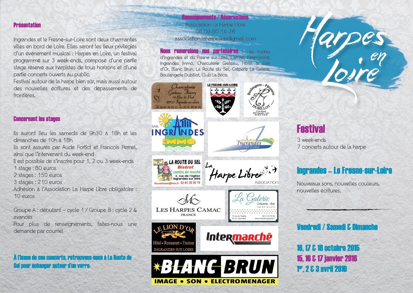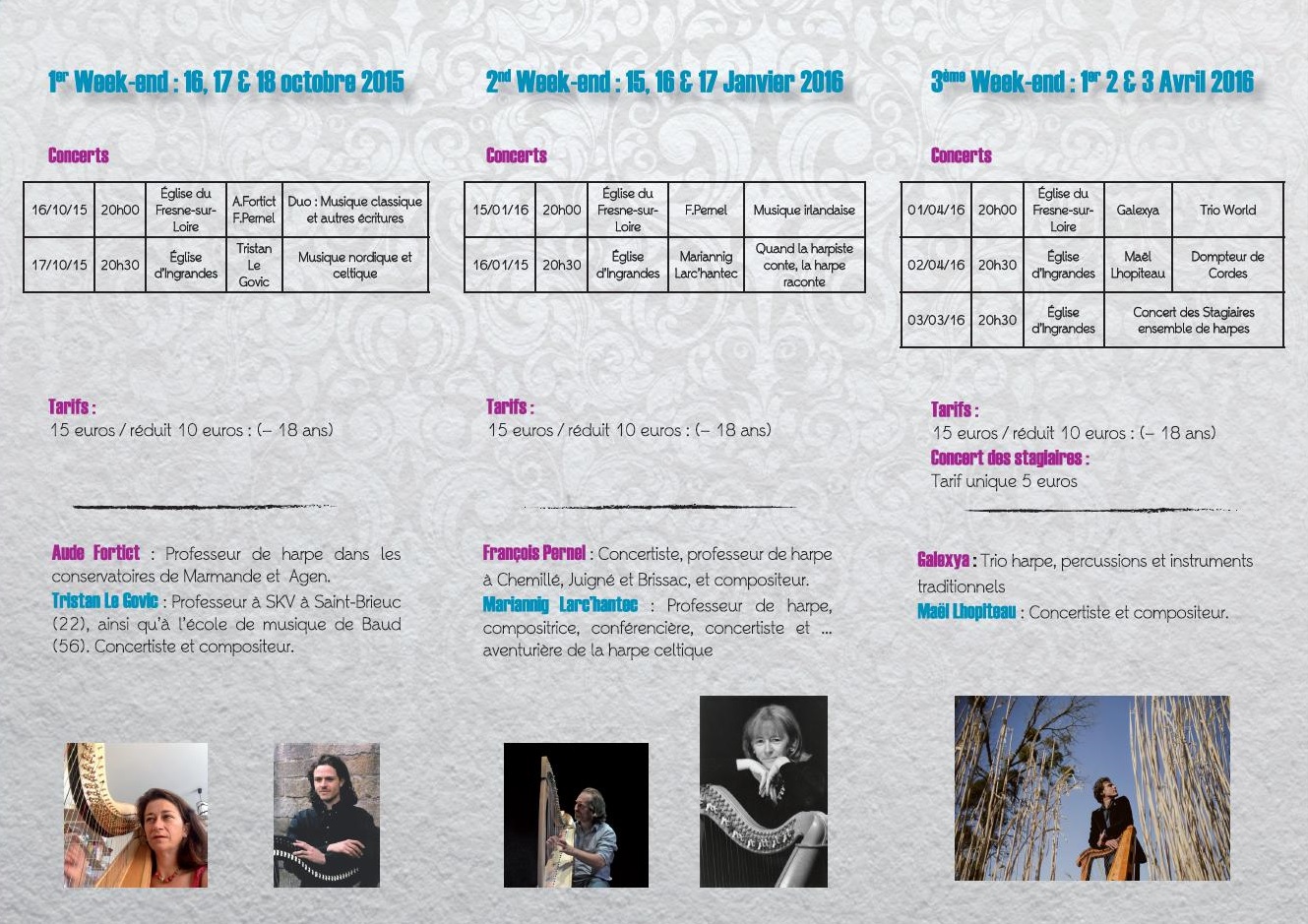 Le festival Harpes en Loire proposera plusieurs concerts. Le 17 octobre, François Pernel et Aude Fortict se produiront en duo de harpes à pédales, le 18 octobre se sera au tour de Tristan Le Govic de proposer un concert autour des musiques nordique et celtique. Le deuxième week-end sera celtique puisque le 15 janvier, le concert sera consacré à la musique irlandaise et le lendemain, Mariannig Larc’hantec nous emmènera en voyage dans l’univers des légendes bretonnes. Enfin, en avril, ce sera le trio world Galexya (harpe, percussions et instruments divers) qui se produira et le 2 avril, Maël Lhopiteau nous fera découvrir ses compositions et son approche des musiques traditionnelles.